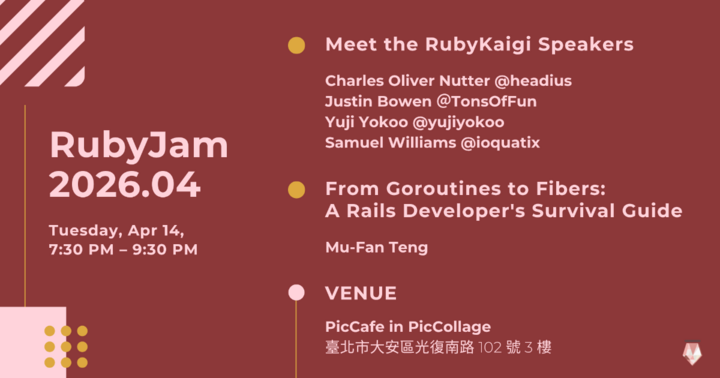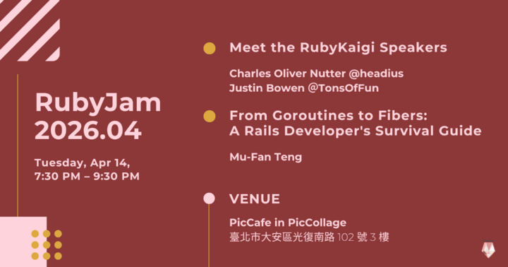 2026/04/14 19:30(+0800)(English Version Below) Ruby Jam: 臺灣 Ruby 程式語言的每月聚會 💎 Ruby Jam 是一個每月舉辦的技術交流活動,為 Ruby 社群提供一個交流、學習和成長的平台。 本月主題 🌟 Meet the RubyKaigi Speakers 🌟立即報名