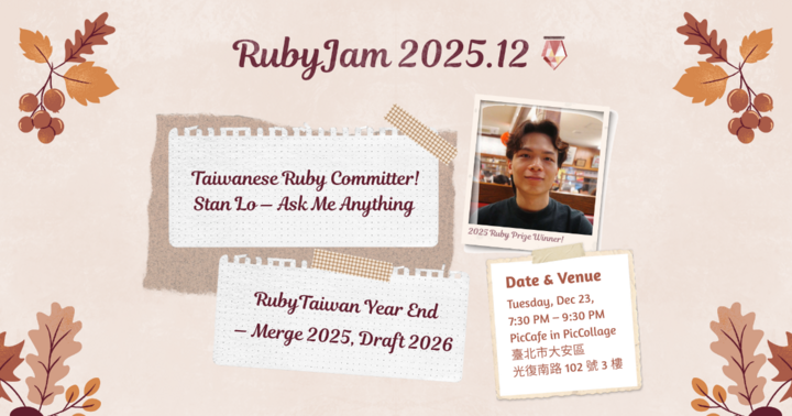 2025/12/23 19:30(+0800)(English Version Below) Ruby Jam: 臺灣 Ruby 愛好者的互動式聚會 💎 Ruby Jam 是一個每月舉辦的技術交流活動,為 Ruby 社群提供一個交流、學習和成長的平台。 本月主題 👏 臺灣首位 Ruby Committer!Stan Lo —すぐ申し込む